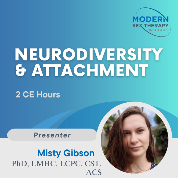 This two-hour course explores how attachment theory intersects with neurodiversity in the context of sexuality, relationships, and clinical practice. Traditional attachment models often assume neurotypical development, leaving clinicians underprepared to address the unique relational needs of autistic, ADHD, and otherwise neurodivergent adults. Participants will examine how sensory processing, executive functioning, and social communication differences can shape attachment patterns and relational expectations. The course will review current literature on attachment and neurodiversity, highlighting both the limitations of existing models and emerging strengths-based frameworks. Dr. Misty will discuss how shame, stigma, and ableism intersect with attachment wounds, and how clinicians can create affirming, accessible interventions for couples and individuals. Special attention will be given to how neurodivergence influences intimacy, sexual expression, and consent practices.