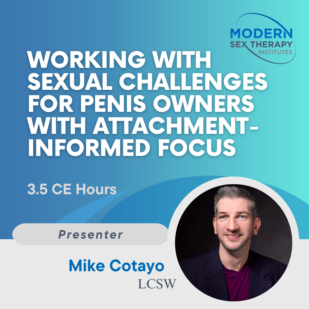Mike Cotayo is a licensed clinical social worker, stand-up comedian, educator, and PhD candidate at the Modern Sex Therapy Institute (MSTI). With over 20 years of clinical experience, he specializes in attachment-informed, trauma-aware approaches to sexuality, personality disorders, and relational dynamics. Mike has taught nationally and internationally on working with Borderline Personality Disorder and on the therapeutic use of humor in clinical practice. Drawing from both professional expertise and lived experience as a person with a physical disability, he brings a compassionate, non-pathologizing, and engaging approach to conversations about male sexuality, attachment, and shame reduction.